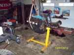 really nothing happening with the wagon till the rag is out of the mancave. but while i was giving a coat of paint to the 454 for the 2+2 i figured i would also give a gm duplicolour rattle can shot at the 427. you know you can't have a clean unpainted block on a stand. i've acquired a big quadrajet carb from rat boy for the 454 so i positioned the intake, carb, valve covers and breather for a photo-op plus it makes me feel like progress.