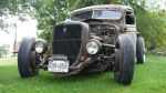 4" chop, 6 1/2" channel.. Sectioned '35 grill and original 35 rad..1956(?) 292 Y-Block w/ Offy intake and 3 carbs..late 70's Econoline 4 speed manual OD trans...1934 box, shortened 18"...Interior compliments of a $25 canvas army tent and seats from a 1950's army ambulance...shes running '32 wheels with Bias wide whites (16 & 17)...fully functional crank out windshield...and lots of little nostalgic "bits"...