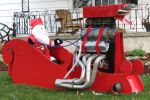 The sled is built from plywood. It features a 5-point harness, wheelie bars, parachute, big-tube headers, 6-71 GM supercharger, 3 two barrel carburetors and a custom scoop/mail-catcher. Taillights are from a 1964 Thunderbird.