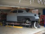 I spent hours and hours truing everything up. I mounted the front fenders and rear quarter panels to get it centered on it's new 118" wheelbase. I also had to get a good sense of ride height so I mounted up some old tires to the size I would be running on my Caddy rims. I still will have a good bit of adjustment on ride height as I can set the original Lincoln air ride to a multitude of positions.