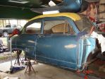 Working on our 51 HenyJ. Body off and bad frame put under the 53 HJ. 53 frame being fitted with the running turbo V6 and 350 trany out of my buddy's 80 Regal. Have trany mount done now getting ready to fab up the engine mounts.