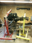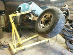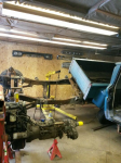 Took the front clip and cab back off to pull the engine, trans and transfer case out. Got the engine, trans and transfer case out now. Tried to lift it with 1 engine hoist. That was a bit sketchy so I use two. Tandem lift by myself not the easiest but I got it done. The red hoist is not the greatest but it did the trick.