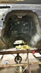 Now I have to cut the engine mounts off the frame and move them back 8". To get them straight I was thinking of cutting a square tube to bolt between the mounts. I think this should hold them in the right place when I weld them in. Does this sound like a good plan or is there a better way? Then I have to move that transmission cross member back. Looked like an easy job until I got under and really looked. The mount is tapered out from top to bottom about a 1/2 inch. The inside frame is stamped to match. Just some more work for me.
