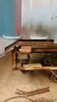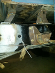 Rhys- The dodge was a farm truck I bought from a buddy. I should have bought a new cab, it would have saved a lot of time. There's still things that have to be fixed on it but I was tired of working on it. That's when short cuts begin so I moved to the frame. All my work happens between 9pm and 1am or nothing would happen on it. I took the crossmember out. The air hammer wouldn't move the rivets at all. It took a 3lbs hammer and a big punch to get them out. Not looking forward to beating out the next 8. The way the frame slides together, I think it won't be to hard to get it straight again. I'm going to mark out some points on the frame and use them as reference points. I will measure them first, make sure they're square, get the frame apart, cut off the 19", get it back together and then measure it all again using the same reference makes. The measurements will be different numbers but as long as it measures square it should be good. It's not like I cut a car down the center from front to back and added 5". This should look easy to you. LOL.