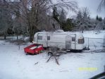Sat Noon...No power and none coming for a while I'm told. Got a genny running for the basics (tv, heat and internet). Got hit pretty hard with lots of trees down on the vehicles. Things are going to look a lot different after this one. Just hoping my birch tree in the front yard can hang in there. All 3 work trucks are covered in fallen limbs but it looks like the motor home is ok but won't know for sure until we can get closer. You can only see the dually in the pics but there are 2 other trucks in behind that are covered in limbs.