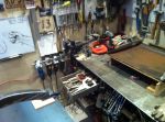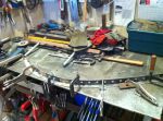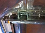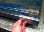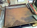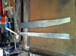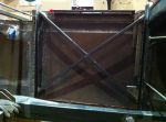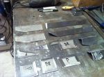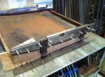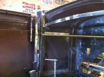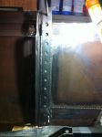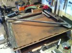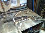 I went into the garage this morning and had an idea! I'm gonna pull out my handy-dandy extend-a-table! It's a wood frame that I made to slip in the end of my build rack to hold large sheets metal pieces to cut and work on. It's tight in here so I gotta utilize any space that I can. I cut a bunch of reinforcing/backer strips out of 16 ga. I have to rebuild my doors. They are woodless, frameless, flimsy pieces of sheet metal with a beltline! I know it's not going to be easy, but I kinda have an idea of what to do to reinforce them, but if anyone has gone through this before or if there are any sheet metal masters out there with any ideas or tips , i'm all ears [and eyes].