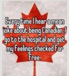 My family would have to spend about $375 every 3 months until "The deductable was achieved" and then it was free. It is very easy for us to reach that deductable because the cost and amount of my own meds alone. Not all meds are covered and I had to fight to get certain life saving meds covered which I eventually pleaed my cases and won. Now we are fortunate my wife has 80% benefits. But back to heathcare....it also saved my dad. His surgery saved his life 11 years ago. If he was in the states and had to pay the $275,000 for his surgery he would be homeless or broke or dead. Our system is far form perfect. It has alot of flaws and there is sheer abuse of the system at hospitals...( people in for cold,sore finger nail,dumb things). But until your in my shoes with an incurable disease where you need hospitals on a regular basis then I am quite proud to be a Canadian and live here.I made the joke photo above(getting feelings checked) because of the abuse at hospitals. Last hospital visit in ER, I had broken my foot, and sitting there having one of my attacks trying not to cause a scene or get thrown out from yelling in pain and in the next bed is someone complaining and yelling at the doctor why they been here 3 hours for a cold and someone came in after them and that they got bumped. Well hey stupid, did ya ever think someones heart attack is more time sensitive than your sniffles? Or that perhaps a car accident happened or whatever.
