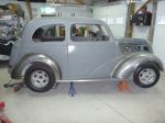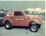As for our Knob Hill Speed and Custom Anglia. The car was built in London in the early 60's. I (John Willoughby) was a sales rep living in Toronto with a sales territory in Scarborough. I became friends with the owner (escapes me too) of Knob Hill Speed Shop who was looking for some real good Anglia panels to use as moulds to make fiberglass Anglia body panels. He had a friend who was in this business. I gave him ours and we were the first to run his fiberglass one piece front end, the doors, the rear fenders and the trunk lid were all fiberglass. They came no charge to us. He agreed to sponsor our car with a free paint job and parts at cost. The car set the NHRA G/Gas record at 10.79 with a modified 292 GMC six cylinder, cut down V-8 heads and a home made Hilborn Fuel Injection set up.