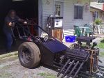 Mike is a Plumber and looks for opportunities like this. It will be on display at Ameliasburgh next week so you can ask him. This all started when I gave him a enlarged copy of a faded Scotty Fenn mechanical drawing of the early rails for Christmas. I figured he would just put it in what he calls his memorabilia room. A few weeks later he phoned and said "you better get down here" When I got there he had one of his spare 331 Hemis sitting on a crate and had duplicated the tubular dragster frame from the drawing around it in black PCV pipe. He played with the design for awhile but didn't like the 3 inch lower frame rail so subbed a 2 inch one. Once he was happy he bought the proper .120" wall DOM mild steel and put is all together. Not wanting to take any chances with the welding he just tacked it all and sent it to a welding shop in the county and had it professionally migged. He got the rear from Denis Kelly (another plumber!) and it appears to be a fork lift unit based on a 8 3/4 mopar. I did the math for him and had a set of 3.55 gears. He bought a spool and 28 inch Mickey street slicks (has to look original) The block was originally a 301 Windsor block aka Chrysler Spitfire but they are essentially the same block as the 331 hemi. the cylinders are THICK! so he took a set of stock 331 hemi pistons he had removed from the engine in his Willys when he built it as it was bored 060" and had the block bored for them. The conversion from Windsor to hemi is a fairly minor thing and after a short discussion on options he went at it a did it. Works perfect. He had the cam made by a friend of mine in TO who has made me many regrinds. It is an ancient 1950s grind and so is period correct. Mike doesn't want a old looking rail with a modern Power plant. He wants it as they were. And the performance as it would have been. He put the engine together under someones watchful eye but did a good job. Pushrods came from Manton and are adjustable. The cam is a hydraulic. At Roblins he found a first generation aluminum case PG and had Golka convert it for race use. Mike made the adapter himself. Using the front section of the original fluid coupling (torque converter almost) and the thick adapter that was always on 55 and later Hemis and Spitfires(poly) . My friend Frank Lupo (Frank Lupos Dynamic Converters) who is probably the best at it in the entire world, custom made Mike a race converter for his cam / car combo and that is a story in itself. Harry Wilson was sending a bunch of stuff for scrap and I spied a marine Hemi 331 intake. (two single barrels) I scored it and we went to Roblins and bought two GMC truck carbs. I had been involved in a successful vintage stock car build and had had one of these carbs on the flow bench so I knew when modified they would deliver 300+ CFM. Two gives over 600 CFM which is more then sufficient for a 331 at 5400 RPM so I knew it would work. Mike likes the look. The scoop was donated by Joe Hendricks (aka GTO Joe) and Mike came up with a neat way of using it but getting more airflow. Then the plumbing began. We were helpless to stop it. ;>) Mike does not run a rad but a storage tank but it works fine. The body he fabbed from galvanized steel for duct work. It is as light as aluminum which surprised me. The ignition is the stock distributor but Mike had me convert it to Chrysler electronic. I machined off the points cam and installed a reluctor instead. A pick up was installed in place of the point and put in Phase with a cutaway cap assembly I made years ago when reworking 440 distributors. The distributor was recurved to suit his cam. It is kinda of an ingenious car and works well. Last race he put Pat Doornbos in it who is very experienced in front engine dragster driving. On the last run Pat stuck it to the floor. He told me the tach was just past 6000 in the lights which if you do the math 3.55 , 28 inch tire 3 to 4 % converter slip (mine is 3 % so Mike's may be that or less being less stall) is somewhere around 140 MPH. I don't know about others but I am impressed. More then Mike ever dreamed of. He is not that comfy with it yet when driving so he may have to stick with a hired gun. That said he is enjoying it to the fullest. Myself I would much rather watch my cars run then drive them other then a check out pass so I understand that. for those who haven't noticed the copper here is the car when it was first pushed out in the sunlight a couple of years ago. Watching Mike build this and sort through the design and difficulties was a treat. He is a doer not a talker for sure.