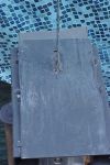 There is a piece of corrugated cardboard at the base of the blade to redirect cutting out of the saw.