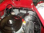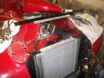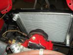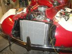 Here are a few shots of my rad installation. My engine sits quite far forward in this car, ( not by my choice ) and the rad has to go forward and under the pointed nose of the top sheet metal. The car had a real small rad ( height and width ) when I bought it,..but 3 core. That rad too had an extension built onto the rad, with the filler neck protruding back toward the engine, ( still a PIA to try and fill, and it looked like hell ) . I bought a new larger, height and width 2 core aluminum rad from Charlie Thurman ( Superior Rad - Michigan ) , and built up my own rad support. As you can see in the photo,..there is a 3/16 " x 2" flat bar that runs directly across the top of the rad and attaches to each side of the rad support to hold the rad down, and in place. In the one photo you can see on the top right corner of the rad where they welded the aluminum plate over the old filler neck hole. The rad sits plenty low below the intake manifold,..where the filler neck now bolts onto. The filler neck showing in the one photo was one of the " hose connect filler necks " ( the hose running from swivel inlet on intake manifold, to filler neck,..and a hose running from filler neck over to rad ) which looked like a cobbled up POS when installed,..my reason for going to the manifold mounted filler neck.