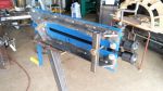 Good eye, the spring has the rod with the handle that runs thru and is the applied pressure to the dies. I've added a second rod that is threaded into a nut welded onto the upper roller guide. the spring raises the upper die as you unwind the handle. (1 rod push down, the other pulls up). the 1"tube will evolve into a straight guide but Primarily it makes the machine riged as a virgin on his wedding night. I locks the upper and lower dies in alignment and removes virtually all deflection in the mainframe. A little crude but you work with what you got,,,