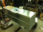 With some cutting, bending and a whole pile of welding I have a 18 gallon fuel tank out of aluminum. It's about 9.5" X 36" X 13" high. Had to build it this way to accept the fuel pump assembly.