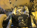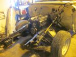 so this week we got the old motor , front brakes, rear axle, all front sheet metal off, and mock up motor/trans installed, new 9" rear axle installed, and new disc brake kit with 2" lowering spindles installed