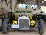 I have four cars, the bantam, the Studebaker wagon, the Model A pickup and the Model A hot rod. Only one has a nick name and the is the hot rod called 'Dog Spit'. Just after I had finished painting the car, a few of us were sitting around the back yard having a refreshment. My Irish Wolfhound was in the garden eating plants when she suddenly kind of thew up. One of the guys mentioned that her spit up was the same color as my car. Dog Spit!!!! I loved it and it stuck. Ten years later it still wears the vanity plates with pride. My all time fav is a plate I saw many years ago before Vanity Plates were available, but you could special order a plate as long as it consisted of three letters followed by three numbers. It read TWO 469 Don't even know how they got away with it.