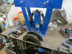 I noticed that the radius on the inside portion of a brake rotor is the same radius I need for tube bending so I thought I'd see if I could make a die from an old rotor. Am I just wasting my time ? The old rotor was free and I don't have any bending dies for my 16 ton bender so what the heck, why not try. I cleaned up the rotor and cut it and then bolted both halves together. Now I just need to figure out how to support the underside of the tube on the sides. But so far, so good. If I can find and old 9" long pipe and cut it in half length wise, I could then slice it part way through in 1" sections and bend it to fit, that might work. Or even half inch slices. I'll put a flat plate on the underside to attach to the large nut that slides on over the top of the jack. I got the jack brand new for $5 so it's worth a try. Or maybe I can find some old dies on FB marketplace ? Who knows ? Probably right after I make one.